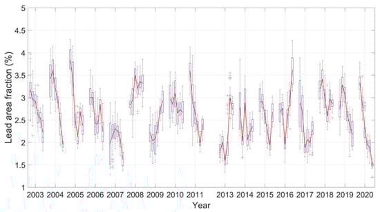 Evolution of sea ice lead fraction in the Arctic north of 65°N in the AMSR family data. On each blue box the central mark indicates the median, and the bottom and top edges of the box indicate the 25th and 75th percentiles, respectively. The whiskers extend to the most extreme data points and the outliers are plotted using the ‘+’ marker symbol. The red lines denote monthly means.
