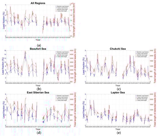 We further divide the Arctic Basin into 10 regions to study the regional differences in the lead fraction (Figure 5). The division of the study areas follows Fetterer et al. [42]. Figure 6 shows the evolution of the sea ice lead fraction and the total length of sea ice leads in different regions in the AMSR family data. The annual values of the sea ice lead fraction retrieved from the AMSR family data are listed in Table 1. In the central Arctic, the annual lead fractions vary from 1.24% to 3.08% during the whole observation timespan, and there is a significant increase in the sea ice lead fraction in the years after 2016 compared to before 2007, indicating that features in sea ice dynamics may have changed substantially in the central Arctic. Compared with other regions, the annual lead fraction shows larger values in the Beaufort Sea and Greenland Sea. In the Beaufort Sea the sea ice lead fraction varies from 2.06% in 2016/2017 to 12.35% in 2007/2008, with a mean value of 5.72%. In the Greenland Sea there is an obvious increase in the sea ice lead fraction, with a rate of 0.13% per year at a 95% significance level; the lead fractions remain stably between 4.06% and 7.37%; and the mean lead fraction over the studying period is 5.77%. It is noteworthy that the sea ice leads in the Baffin Bay increase sharply in 2008/2009, 2010/2011, and 2017/2018. Furthermore, there is a decrease in the sea ice lead fraction in the Eastern Siberia–Laptev–Kara Sea from the AMSR-E period to the AMSR2 period, probably relating to the changes in wintertime sea ice properties in the past two decades. Partly owing to the relative coarser spatial resolution, the annual sea ice lead fractions derived from the AMSR2 data are comparable to the results in Hoffman et al. [31] but smaller than those in Willmes and Heinemann [26]. The total length of sea ice leads is highly correlated to the sea ice lead fraction in all regions (Figure 7). The correlation coefficient is as high as 94% in daily maps.