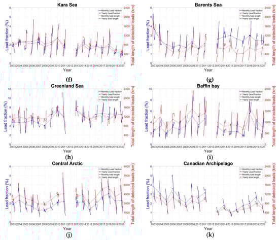 Evolution of sea ice lead fraction (blue color) and total length of sea ice leads (red color) in km in different regions in the AMSR family data. Solid lines denote monthly mean values. Dashed lines with circles denote annual mean values. (a) Whole Arctic, (b) Beaufort Sea, (c) Chukchi Sea, (d) East Siberian Sea, (e) Laptev Sea, (f) Kara Sea, (g) Barents Sea, (h) Greenland Sea, (i) Baffin Bay, (j) central Arctic, and (k) Canadian Archipelago.