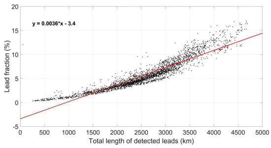 Correlation between sea ice lead fraction and total length of sea ice leads. Red line is a linear regression line with a fitting equation y = 0.0036x − 3.4.
