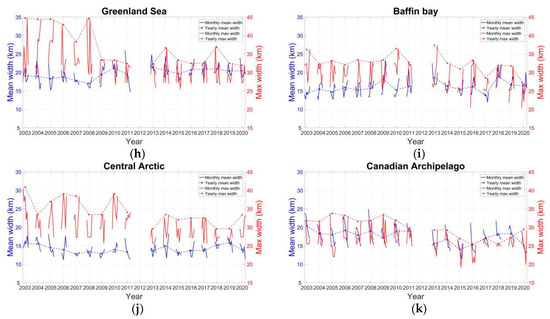 Evolution of max width (red color) and mean width (blue color) in sea ice leads in different regions in the AMSR family data. Solid lines denote monthly mean values. Dashed lines with circles denote annual mean values. (a) Whole Arctic, (b) Beaufort Sea, (c) Chukchi Sea, (d) East Siberian Sea, (e) Laptev Sea, (f) Kara Sea, (g) Barents Sea, (h) Greenland Sea, (i) Baffin Bay, (j) central Arctic, and (k) Canadian Archipelago. Unit is km.