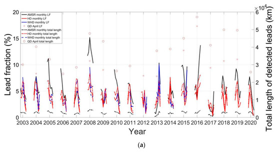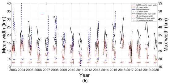 Finally, we compare our results in the Beaufort Sea with those values identified from the three MODIS datasets. The Beaufort Sea is selected because sea ice leads are prevalent in this region and the QD product only covers this region. The comparison shows that the sea ice lead fraction in the AMSR family data is generally larger than that of the WHD and HD products, but smaller than the QD product in years after 2010. However, the total length of sea ice leads (1.17 × 103 km to 4.07 × 103 km) in the AMSR family data is much smaller than the three MODIS data (Figure 9a). This result probably comes from the fact that sea ice leads with a width less than 6.25 km cannot be retrieved from the AMSR family data. The maximum width (25.4 km to 36.3 km) in the AMSR family data is generally smaller than the WHD product but larger than the HD and QD products. The mean width (11.0 km to 31.4 km) in the AMSR family data is larger than the three MODIS datasets, probably owing to the relatively coarse resolution.