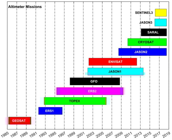Altimeter missions used in the analysis. The duration of data available from each mission is shown [,].