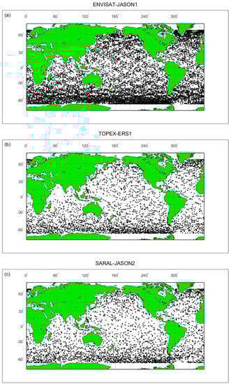 As shown in Table A1, the number of matchups ranges between 1631 (SENTINEL3–JASON2) and 49,264 (JASON1–JASON2). Although matchups typically are distributed across the globe, they are concentrated at high latitudes, as shown in the examples in Figure 3.