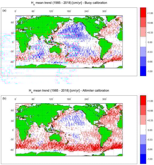 Noting that both calibration methods have issues with non-homogeneity, it is not obvious why the “altimeter–altimeter” approach yields stronger trends than the “altimeter–buoy” method. As the “altimeter–altimeter” method does have data from the full globe (although concentrated at high latitudes in the Southern Ocean), it is possible that it is less impacted by such non-homogeneities. It is certainly in better agreement with trends from model hindcasts [].