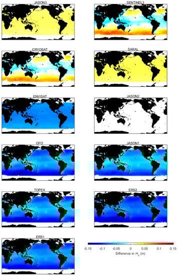 Differences between mean significant wave height averaged over each altimeter mission for different calibration approaches , where and are values of for the “altimeter–buoy” and “altimeter–altimeter” calibrations, respectively. Units shown in color bar (m). Order of altimeter mission launch dates is from the bottom to top and left to right: ERS1, TOPEX, ERS2, GFO, etc.