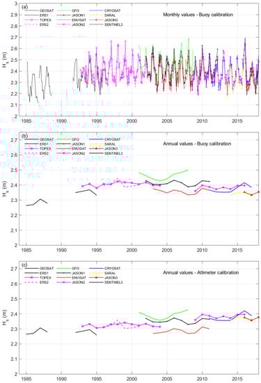 The seasonal cycle can be removed by considering annual means, as shown in Figure 6b (“altimeter–buoy” calibration) and Figure 6c (“altimeter–altimeter” calibration). The stronger positive trend in the “altimeter–altimeter” calibration is clearly visible (i.e., a stronger trend in Figure 6c than Figure 6b). It is also clear that for the “altimeter–buoy” calibration, there are inconsistencies (non-homogeneities) between altimeters operational at the same time, which are as large as the total trend. Surprisingly, however, similar non-homogeneities also exist for the “altimeter–altimeter” calibration (Figure 6c), despite the fact that, in this case, the altimeters were calibrated against each other.