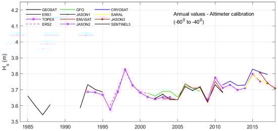 As seen in Figure 3, the matchup locations used for the “altimeter–altimeter” calibrations are not uniformly spread across all latitudes. Rather, they are concentrated at high latitudes, particularly in the Southern Hemisphere. There is also some evidence from Young and Donelan [] (their Figure 9) that calibrations of altimeters against buoys may change at high latitudes. The differences [] may be as large as 5%, consistent with the differences in Figure 6c. In order to test this possibility, the annual average values of shown in Figure 6c were recalculated but only averaged over latitudes from −40°S to −60°S. That is, the average is performed over the latitudes where the majority of the “altimeter–altimeter” matchups are located. The averages of these Southern Ocean latitudes are shown in Figure 7 for each of the altimeters. Comparing Figure 7 with Figure 6c, it is clear that the inconsistencies between the altimeters are much reduced when the averaging occurs over similar latitudes to where the majority of the matchups are located. Not surprisingly, there is greater year-to-year variability in Figure 7 than in Figure 6c, as the averaging occurs over a much smaller geographical region of the Earth.