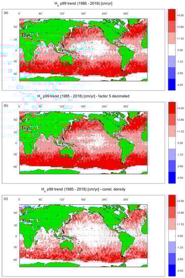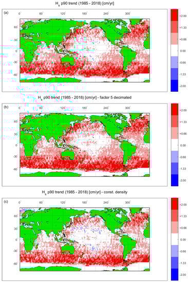 Here, we adopt an approach similar to that of Young and Ribal [] and resample the altimeter database to investigate the sensitivity of trend estimates of higher percentiles (90th and 99th) on the sampling pattern. Two sets of experiments were performed. In the first, the data were decimated by a factor of 5. In the second experiment, the altimeters JASON3, SENTINEL3, and SARAL were excluded, resulting in a more uniform density of observations over time. For each experiment, the trends in the 90th and 99th percentile significant wave height were estimated from the Sen slope [] of monthly values. Figure 8 and Figure 9 show the global trends for the 90th and 99th percentile , respectively. Each figure shows (a) trend using all the data, (b) trend with data decimated by a factor of 5, and (c) trend with the data density approximately constant over time.
