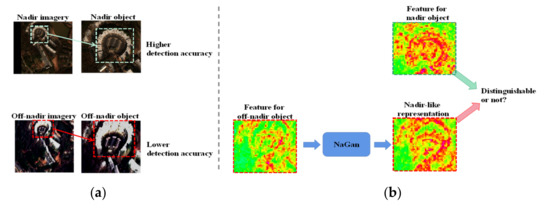Difficulty illustration of object detection on off-nadir image. (a) The nadir object is different from the off-nadir object with respect to appearance due to viewpoint differences and imaging uncertainties, and features of nadir and off-nadir objects are exhibited differently by traditional detectors, which impacts detection performances. (b) NaGAN aims to generate the nadir-like representation for the off-nadir object, and a higher detection accuracy is gained on off-nadir images.