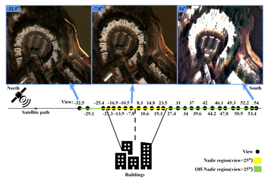 For illustration, the two difficulties are elaborated below. At first, the foremost difficulty lies in viewpoint differences and imaging uncertainties. For the nadir imagery acquired at different times, the same object has similar features with respect to shape, edge, and texture. However, for the off-nadir imagery obtained by a sweep-broom satellite, the viewpoints are different, and the illumination and reflection conditions of the same object vary significantly. Moreover, the contents of the two-dimensional projection along different sightlines are different, which makes the features obtained from the same object different and the amount of information different. As shown in Figure 1, viewpoint differences and imaging uncertainties enlarge the intra-class differences, and object detection from off-nadir imagery is thus difficult.