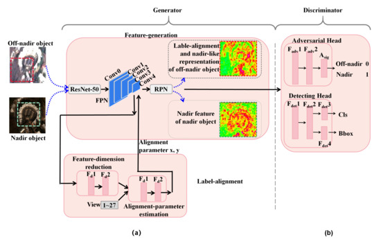 - The generator consists of the feature generation and the label alignment. The feature-generation aims to generate the nadir-like representation for the off-nadir object. The label alignment aims to assist the feature generation, which aligns the feature map of the off-nadir object and aims to pertinently generate a nadir-like representation.