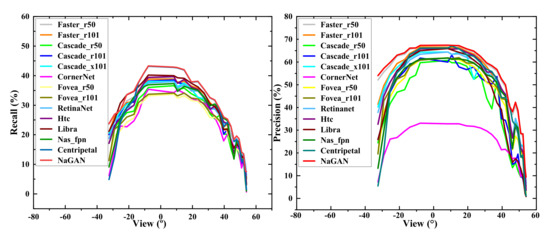 Performances by different methods are listed in Table 1. For all methods, it can be observed from other views that AP@0.5 decreases gradually with the view from nadir −7.8° to other views. The reason is that the deformation of the off-nadir object increases the detection difficulty. The AP@0.5 descends to the lowest value at −32.5° and 54° views.