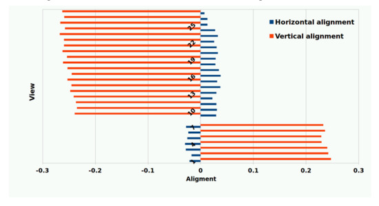 Records of the label-alignment parameters for 5778 images (214 × 27 views) from 214 scenes in the test dataset. It can be observed that the trend of vertical offsets from nadir to off-nadir along the flight direction of satellites is increasing, which demonstrates the effectiveness of label alignment.