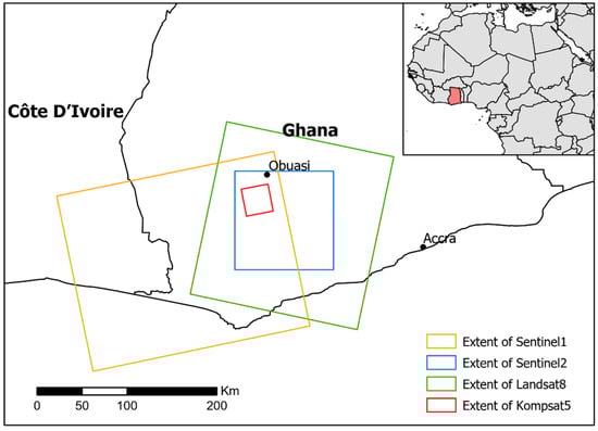 The footprints of the satellite imagery used in this study are located in Southern Ghana. All the imagery was cropped to the KompSAT-5 footprint that delineates the study area.