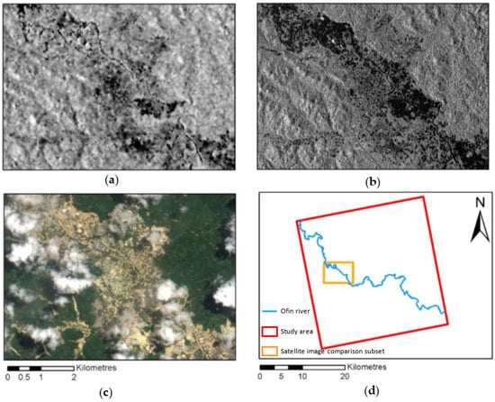 Example subsets of imagery used: (a) Sentinel-1 VH backscatter from 8 August 2018, (b) KompSAT-5 VH backscatter from 12 July 2018, and (c) Sentinel-2 true-color image taken on 5 August 2018, where (d) gives the extent of the example subset area The example area highlights a section of the Ofin River where abundant small-scale mining takes place.