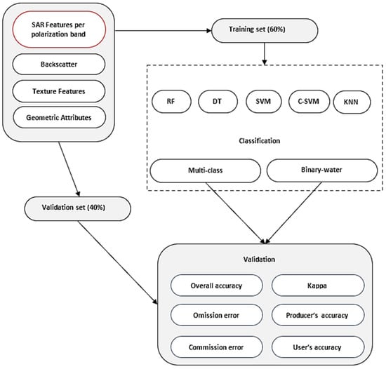 The research design is illustrated in Figure 3. First, the SAR features were extracted per object after image segmentation was applied. Then, samples were collected for input to the training and testing datasets for the machine learning classifiers. Next, the classifier was run on each dataset. Lastly, validation statistics were performed to analyze the accuracy and reliability of each classifier or dataset.