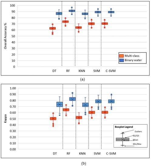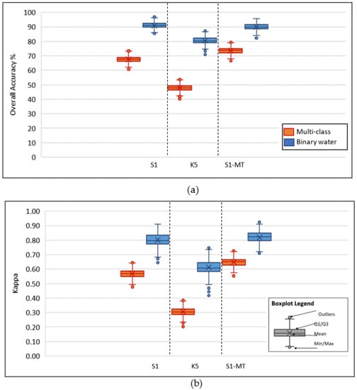 The S1-MT dataset has the highest overall accuracy at 73.60% for the multi-class classification scheme and S1 has the highest overall accuracy at 90.93% for the binary water classification scheme (Figure 4). However, the S1-MT dataset has the highest kappa coefficients at 0.65 and 0.82 for the multi-class classification scheme and binary-water classification scheme, respectively. The K5 dataset yielded the lowest overall accuracy and kappa coefficients at 80.61 and 0.61, respectively, for both the multi-class classification scheme and the binary-water classification scheme.