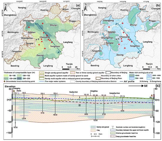 (a) Lithologic characteristics description of aquifer, the thickness of compressible clay layer and distribution of groundwater level monitoring points in the study area. (b) The distribution of water-rich zoning in Beijing plain, and water yield of single well when the precipitation is 5 m (unit:m3/d). (c) The map of Changping–Tongzhou district (AA’ profile line) hydrogeological profile.