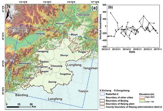 (a) Description of datasets coverage in the study area, in which the blue dotted rectangle represents the coverage of RadarSat-2 data in Beijing plain area. (b) For the RadarSat-2 satellite data set, the vertical baseline map of interference relative sets selected with temporal baseline less than 300 days and spatial baseline less than 300 meters.