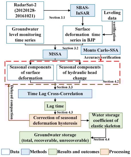 In this study, based on time series deformation information obtained by SBAS-InSAR, the seasonal components of deformation and hydraulic head change were decomposed by MSSA. Then, we introduced the TLCC approach to correct the hysteresis response of seasonal deformation relative to the variation of aquifer system head, so as to realize the estimation of aquifer storage properties and GWS loss. The overall methodology of this study is summarized as follows (Figure 3):