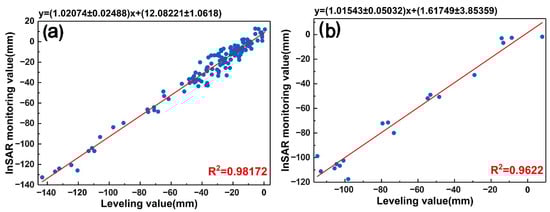 (a) Linear regression results of InSAR vertical deformation and leveling from 2012 to 2013. (b) Linear regression results of InSAR vertical deformation and leveling from 2015 to 2016.