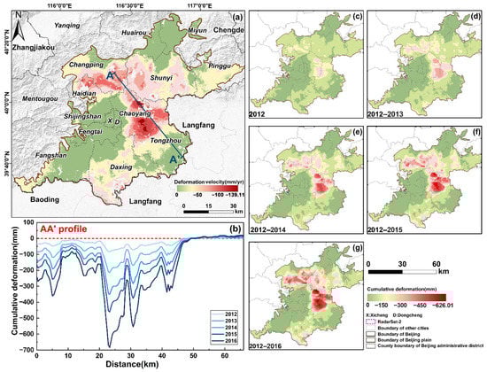 (a) Annual average deformation velocity map of Beijing plain from January 2012 to October 2016 based on 46 RadarSat-2 images. (b) Cumulative deformation year by year at profile line AA’ in Figure 5a. (c–g) The spatial evolution of cumulative deformation velocity (mm/yr) from 2012 to 2016 after IDW interpolation in space.