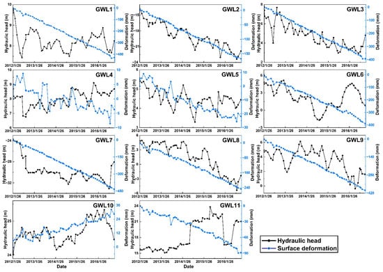 By comparing the trend of cumulative surface deformation with the groundwater level change of groundwater level monitoring points (Figure 6), it was found that the deformation of most monitoring points was positively correlated with the water level. On the whole, the surface deformation declined to varying degrees, and the downward trend between the deformation and head change at GWL2, 3, 5, 6, 7, 8 and 9 was relatively consistent. Compared with deformation, the hydraulic head of confined aquifer fluctuated more significantly in time series due to the influence of periodic groundwater exploitation and precipitation. Among these points, the head change at GWL2, 3, 5, 6, 7, 8 and 9 showed a downward trend, while GWL1, 4, 10 and 11 showed a stable and even rising trend. It is worth noting that, after the SNWDP formally diverted water to Beijing at the end of 2014, the pumping rates of the groundwater well field decreased, resulting in an increase in the overflow recharge of middle-deep confined aquifers. Therefore, the head of the middle-deep confined aquifers recovered significantly at some groundwater level monitoring points, such as GWL1, 4, 5, 6, 7, 9, 10 and 11. Among them, the maximum head rebound was located at point 6, with a rebound of 5.41 m from December 2014 to March 2016. However, the head change of the middle-deep confined aquifer at GWL2, 3 and 8 still maintained a long-term downward trend, and even decreased again after water head recovery at GWL1, 6, 9 and 10, indicating that the deep groundwater in these areas may still have been over extracted.