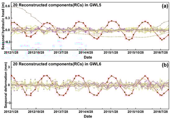Spectral distribution of 20 signal RCs after MSSA decomposition, among which red dotted lines represent seasonal signals with periodic oscillations. (a) This represents the spectrum of RCs of the head change at GWL5 after decomposition. (b) This represents the spectrum of RCs of the deformation at GWL6 after decomposition. The deformation at this point is taken as the mean value of the vertical deformation of coherent points in the 100 m buffer zone near the GWL6.