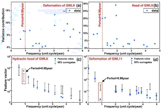 In order to further explore the variation relationship and characteristics of seasonal deformation and seasonal hydraulic head, we applied the MSSA approach to decompose the seasonal signals of these two kinds of temporal information, respectively (the delay window was 15), and retained 20 RCs of each group, including low-frequency long-term trend and noise signals. Here, we take the seasonal head of GWL5 and the seasonal deformation of GWL6 (Figure 7a,b), where the red dots and line represent periodic oscillations at this point. By combining characteristics, such as amplitude and wave period length, it can be clearly distinguished from other RCs with different frequencies. According to the variance contribution rate corresponding to the main frequency associated with different RCs (Figure 8a,b), it was found that the variance contribution rate of the seasonal deformation component was about 6.58% while that of the seasonal head component was about 19.97%. In addition, in order to ensure that the separated seasonal signals did not contain stray oscillations caused by atmospheric delay phase, we utilized the MC-SSA to verify the authenticity, through to the different frequency characteristic vector by building a 95% confidence interval (Figure 8c,d), and found that the frequency (f = 0.98) corresponding to the seasonal signals was outside the error bar. This indicates that the seasonal components extracted by MSSA were authentic and dependable.