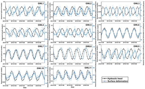 Therefore, by further comparing the seasonal components of surface deformation and hydraulic head change, obtained by means of MSSA (Figure 9), it was found that the seasonal surface deformation and hydraulic head change of almost all monitoring points had good consistency and fluctuation, with obvious periodic oscillation occurring. By further comparing the amplitude and the position time at the peak/trough of the seasonal deformation and the head change, it was found that there was a lag response of different degrees between the two above, with characteristic spatial differences. Among them, the lag response time of GWL1, 3, 4, 5 and 9 was obviously longer than that of other groundwater level monitoring points, while the peak interval at GWL6, 7, 8, 10 and 11 was significantly smaller than that of other points, which may well be related to the lithology of the aquifer, including the thickness of particulate matter and the thickness of the compressible clay layer. Therefore, it was necessary to obtain the seasonal deformation corresponding to a prescribed head change in time considering the hysteresis influence so that the aquifer storage properties could be further estimated.