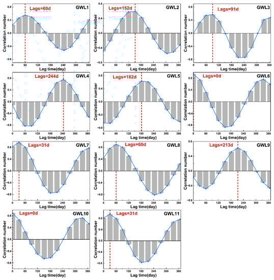 Surface deformation has the lag different degrees to the change of head (Figure 9). The cross-correlation coefficient and lag time (Figure 10) between the seasonal surface deformation and the change of head through the TLCC were compared and analyzed in the study, and meanwhile, the seasonal deformation through constant displacement was calibrated using the estimated time lag. Moreover, TLCC analysis was used to determine whether there was a strong correlation between surface deformation and the groundwater level change. If the maximum cross-correlation coefficient is greater than 0.5, the seasonal fluctuation near the monitoring well is most likely to be caused by seasonal head change, whereas if the maximum cross-correlation coefficient is less than 0.5, the seasonal deformation or head change may well be disturbed by noise so that the correlation between them is weaker. By comparing the results of the TLCC analysis (Figure 10), it was found that there were spatial differences in the lag response time of different groundwater level monitoring points. The longest lag response time of GWL4 was 244 d, while the shortest lag response time of GWL6 and GWL10 was 0 d. Furthermore, the maximum correlation of all groundwater level monitoring points was greater than 0.5, and the maximum value was 0.96 at GWL7, indicating that there was a strong correlation between seasonal deformation and seasonal hydraulic head change, and the surface deformation there was mainly induced by hydraulic head fluctuation corresponding to the mining depth. The maximum correlation coefficients of GWL1 and 3 were between 0.50 and 0.55, which are smaller than other points, which may be because of noisy interference, unapparent and anomalous seasonal deformation signals, and the deformation presumably caused by deeper hydraulic head fluctuations.