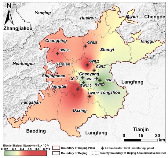 For the purpose of representing the spatial variability of the storativity characteristics of the aquifer system, the elastic skeletal storativity coefficient of 11 monitoring wells were estimated by means of Equation (6) (as shown in Table 3). The calculated results were in the range of the theoretical value domain of the coefficient n × 10−5–n × 10−3 [,]. For the sake of exploring the inhomogeneity on the spatial scale of , IDW interpolation was applied to obtain the spatial distribution of (Figure 11). The values of ranged from 0.197 × 10−3 to 0.719 × 10−3, manifesting obvious spatial differences and the aquifer lithology at all points above was composed of 2–3 layers of sand and gravel layers. In general, considering the influence of the geological structure of the Beijing plain, the impact of aquifer permeability in the pluvial fan interaction area became weaker step-by-step, which, to a certain extent, brought about the elastic skeletal storativity coefficients on the space diversity, as well as the uneven subsidence of Beijing.