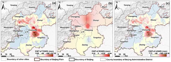 (a–c) According to equations in Section 3.4, the average change volume of TGWS, RGWS and UGWS during the study period. All volume changes are expressed as EWT (unit: mm).