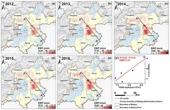 (a–e) The evolution of UGWS depletion yearly from 2012 to 2016. (f) The TGWS results were verified and fitted with the results of Beijing Water Resources Bulletin.