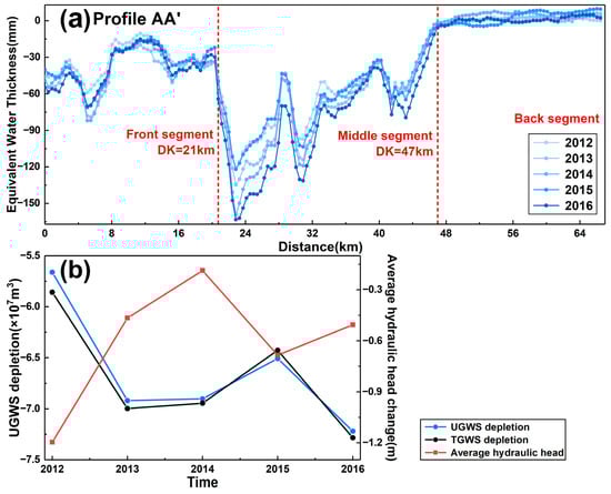 (a)The depletion of UGWS in profile A-A’. (b) Comparison of UGWS depletion and average total head change trend year by year. (DK: distance/km).