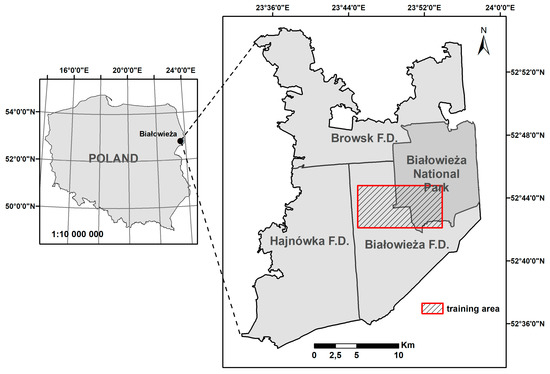 The choice of location for the training area was based on the best possible representation of the objects from the listed classes (described in Section 2.6). The training area has a rectangular shape, a size of 5 × 10 km (50 km2) and is located on the territory of the Białowieża Forest District and the Białowieża National Park (Figure 1).