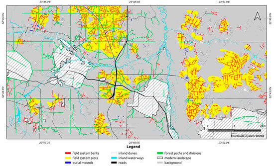 In Poland there are relics of ancient agricultural field systems with different spatial patterns. Field systems whose spatial arrangement is consistent with Celtic fields described in other European countries have also been identified. Using ALS data from forested areas, Banasiak and Berezowski discovered hundreds of such locations over the whole area of country via desk-based work. The discovery was supported by AlexNet and ResNet [44]. Despite extensive occurrence of Celtic fields, excavations and dating have been very limited. Approximately 300 km of linear terrain elevations of earth and mudstone of 2–8 m in width and several dozens of centimetres in height were identified in many areas of the investigated complex of the Białowieża Forest. Fragments of the discovered field systems were investigated by excavation as well as geophysical and soil analyses. This made it possible to date them back to the pre-Roman period, the period of Roman influence and the early Middle Ages [7,45,46,47,48]. Remains of ancient field systems chronologically associated with the Late Roman period have also been detected in the Tuchola Forest [49].