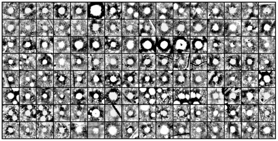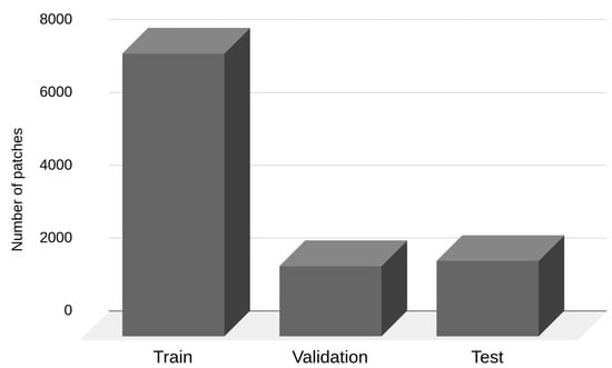 Augmentations were performed using an augmentation library [61]. The prepared sets were normalized to be in the range of 0–1. As a final step in the preprocessing phase, the RGB masks were encoded using a one-hot encoding, also known as the “dummy variable” method. This method also ensures normalization of categorical variables. The encoding transforms the label tensor from the form of (N,W,H,3) to (N,W,H,9), where N is the number of samples, W is the width and H is the height; the last parameter represents a change from the number of channels to the number of classes. The final dataset consisted of 7779 training and 1945 validation patches (Figure 8).