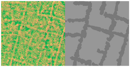 The prepared dataset consisted of 2600 images comprised 512 × 512 pixels, the basis for deriving the training and test sets. The training set and test set consisted of 2080 and 520 images, respectively; each has an associated mask with regions of interest; each class was marked with a specific colour. The data were distinguished between 9 classes (including background). Figure 6 shows an example pair of an input image and a corresponding mask (Celtic fields).