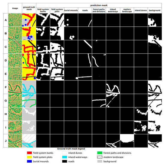The values of the IoU metric for the included classes on the test set are presented in Table 3. The IoU metric was 0.41 for ancient field system banks, 0.616 for ancient field system plots and 0.62 for burial mounds.