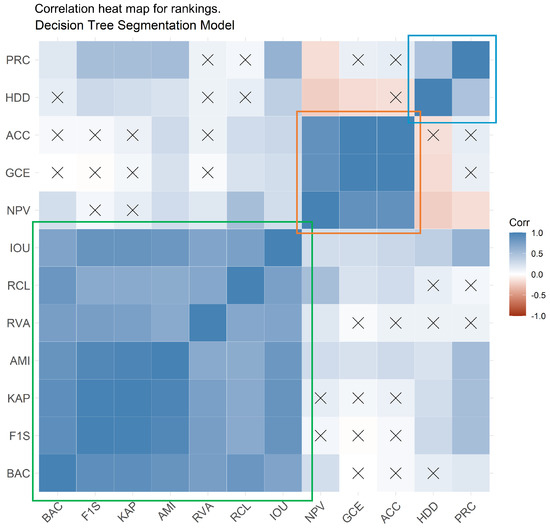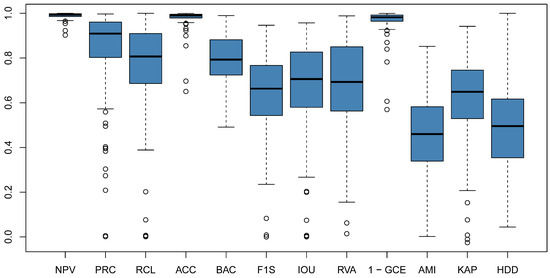 As the presented results clearly showed, the twelve metrics studied can be separated into three distinct groups: the green group consisting of Balanced Accuracy (BAC), Recall (RCL), F1-Score (F1S), Cohen’s Kappa (KAP), Intersection Over Union (IOU), Relative Vegetation Area (RVA), and Adjusted Mutual Information (AMI); the orange group consisting of Negative Predictive Value (NPV), Global Consistency Error (GCE), and Accuracy (ACC); and the blue group consisting of Precision (PRC) and the Hausdorff Distance (HDD). Even though the statistical methods proposed allow for the recognition of a pattern among the metrics, they do not explain precisely why certain metrics are in the same group, while others in a different group. The goal of the study was not only to analyse the structure of the evaluation metrics, but also to try to understand this in the specific context of the segmentation of images obtained by proximal sensing.