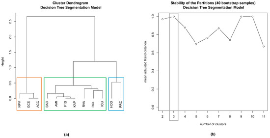 Applying the clustering of variables allowed us to clearly identify distinct groups of metrics. Three groups of metrics were identified based on the results shown in Figure 4 where the optimal number of clusters can be seen to be three, in Panel (a), since it is the number of clusters after which the loss of homogeneity becomes quite considerable for additional clusters. This is also confirmed in Panel (b), showing the value of the mean of the adjusted Rand index computed by comparing 40 bootstrap samples and the initial hierarchical partition. The maximum value appears to be at three clusters, signifying that this is the most stable level of partitioning [38].