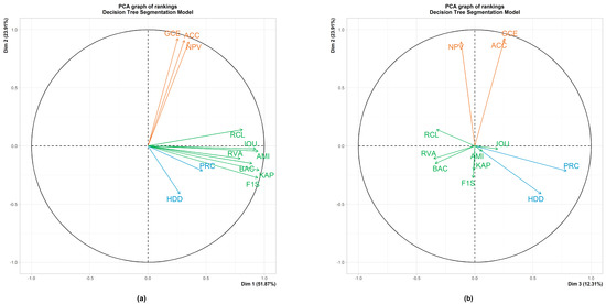 - Multiple factor analysisIn Section 3.1.1 and Section 3.1.2, the results of the three exploratory methods are shown only for the decision tree segmentation model, for conciseness. However, in order to verify that the results we obtained were not model dependent, we applied a Multiple Factor Analysis (MFA) [42,43] on the rankings produced by the three models. The result of this analysis would show us whether the relationships among the metrics differ largely from one model to another, or otherwise. From a simple perspective, the MFA can be understood as a PCA applied on the principal components obtained by the separate PCAs for each model, although the method is more elaborate. The most valuable result produced by MFA for this study was the representation of the partial axes. It consists of visualising the projection of the first and second dimensions obtained in each separate group PCA, on the principal plane of the MFA, formed by the first and second principal vectors of the MFA [42]. Such a method allows visualising how well correlated each of the most important dimensions of each group are with their respective global ones, in addition to showing their correlation among each other. The MFA was implemented in R using the package FactoMineR [41].