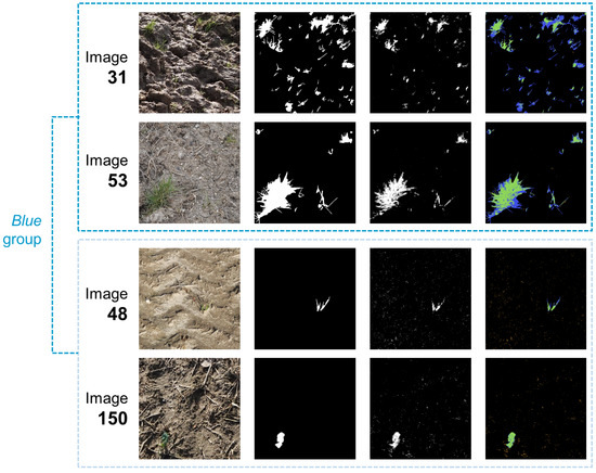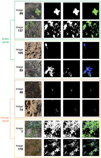 Another clear pattern that can be identified is the difference in the sizes of the objects in the images at the top of the point cloud projected on the first principal plane in comparison with those at the bottom side. The images at the top, whether they are well segmented (on the right, as 46), or badly segmented (on the left, as 74), all contain small plants (Figure 6 and Figure 7). On the other hand, we can clearly see that on the bottom-side images, the plants take up a considerable area in the images. To understand this contrast in sizes, we have to reason in relation to the proportion of plant pixels in this context of binary classification and the group of metrics giving a high evaluation for one group or the other. Indeed, the size of the plants in the images can be simply understood as the proportion of plant pixels in the image, that is the positive cases in terms of binary classification. When the plants are very small, there is a drastic imbalance between the plant and background classes, while in images that present a higher plant surface, the two classes are better balanced. Accordingly, the images at the upper side of the point cloud are those that were highly evaluated by the orange group of metrics, which was highly positively correlated with the second dimension. It is well known and was shown in [4] that the accuracy does not provide reliable results when there is considerable imbalance between the classes. In particular, when both training and test sets present the same direction of imbalance—which is the case here, as the majority of images had more background than plant—the accuracy will yield an optimistic evaluation. It is also for this reason that the NPV gave a high evaluation, since it is a metric that emphasises TNs, which are much more likely to appear as the negative cases form the majority class.