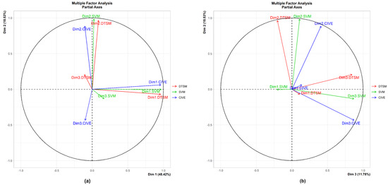 MFA partial axes’ plot: (a) 1st and 2nd dimensions; (b) 3rd and 2nd dimensions.