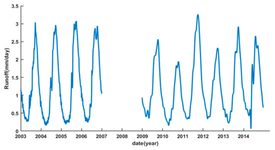 Daily runoff time series of TC-CD stations within the river delta during 2003–2006 and 2009–2014.