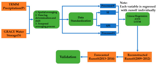 Notably, in hydrological practice, linear regression, hydraulic functional relationship, time series model, and the neural networks (NN) model are the four methods employed for the runoff reconstruction and forecast. The linear regression and hydraulic functional relationship are commonly employed for the runoff reconstruction using remotely-sensed data. For instance, the in situ runoff is related to TRMM precipitation via linear regression, while it is related to the monthly basin-averaged land water storage (or water level) via hydraulic functional relationship (e.g., the power function). Furthermore, time series model and NN model are widely used, in which NN model gives a relatively more accurate results that of other methods [31]. However, under normal circumstances, data, taking no account of potential biases, are input directly into the above models. Note also that data are input into NN model in different orders with several runs that generate different numerical results during training and testing stage.
