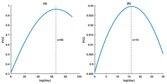 After spatially averaging over the whole Yunnan Province for a single TRMM daily precipitation and GRACE daily land water storage time series, the time lag between the in situ runoff and TRMM precipitation (or GRACE land water storage) at the upstream during 2003–2006 was calculated for every lagged day up to 90 days (or 30 days), respectively (Figure 5). The maximum PCC between the in situ runoff and TRMM precipitation (or GRACE land water storage) at the upstream was attained when the lagged time was 66 days (or 16 days), respectively. This is due to the fact that the upstream available water takes 66 days (or 16 days) for precipitation and land water storage to reach the estuary mouth. This implies that TRMM precipitation (or GRACE land water storage) at the upstream, when available in advance, can be able to forecast the runoff. Hence, the established empirical relationship should provide an early warning of extreme hydrological events in the river delta. As a result, the in situ runoff was shifted 66 days (16 days) backward with respect to precipitation (land water storage), respectively, before the linear regression using Equation (2).