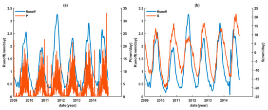 Time series of (a) TRMM daily precipitation (i.e., P) (66 lagged days) and (b) GRACE daily land water storage (i.e., S) (16 lagged days) spatially averaged over Yunnan Province at the upstream Mekong Basin against the in situ runoff during 2009–2014.